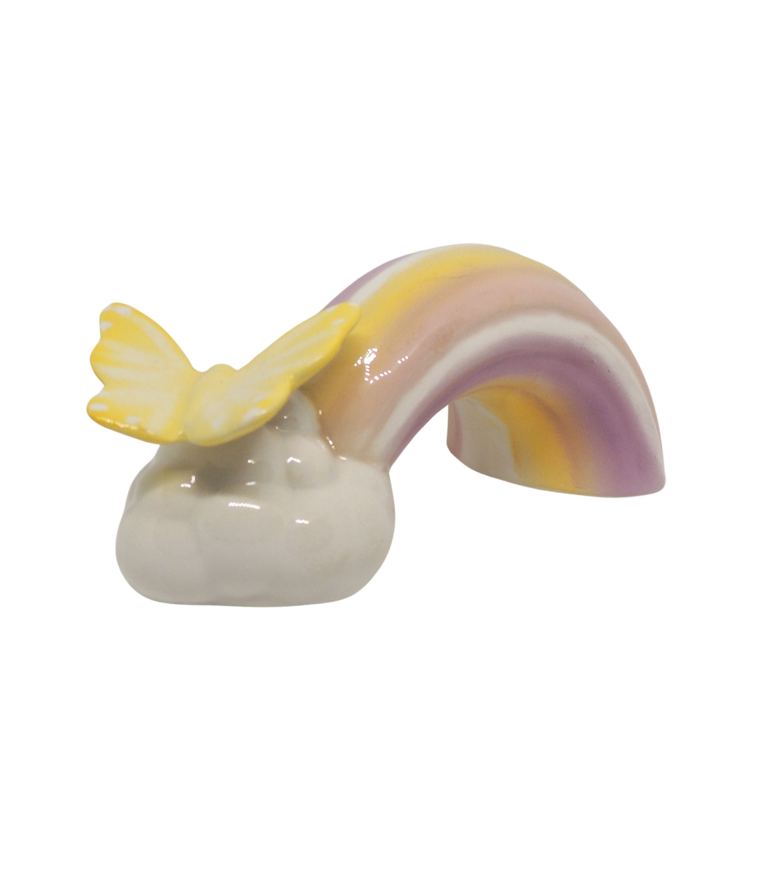 Benvenuti nel mondo incantevole delle bomboniere di Oro Bianco Capodimonte, dove la tradizione si fonde con l'arte, come questi coloratissimi arcobaleni che nascono da una nuvoletta e su cui poggia delicatamente una farfalla. Realizzabili in diversi colori.