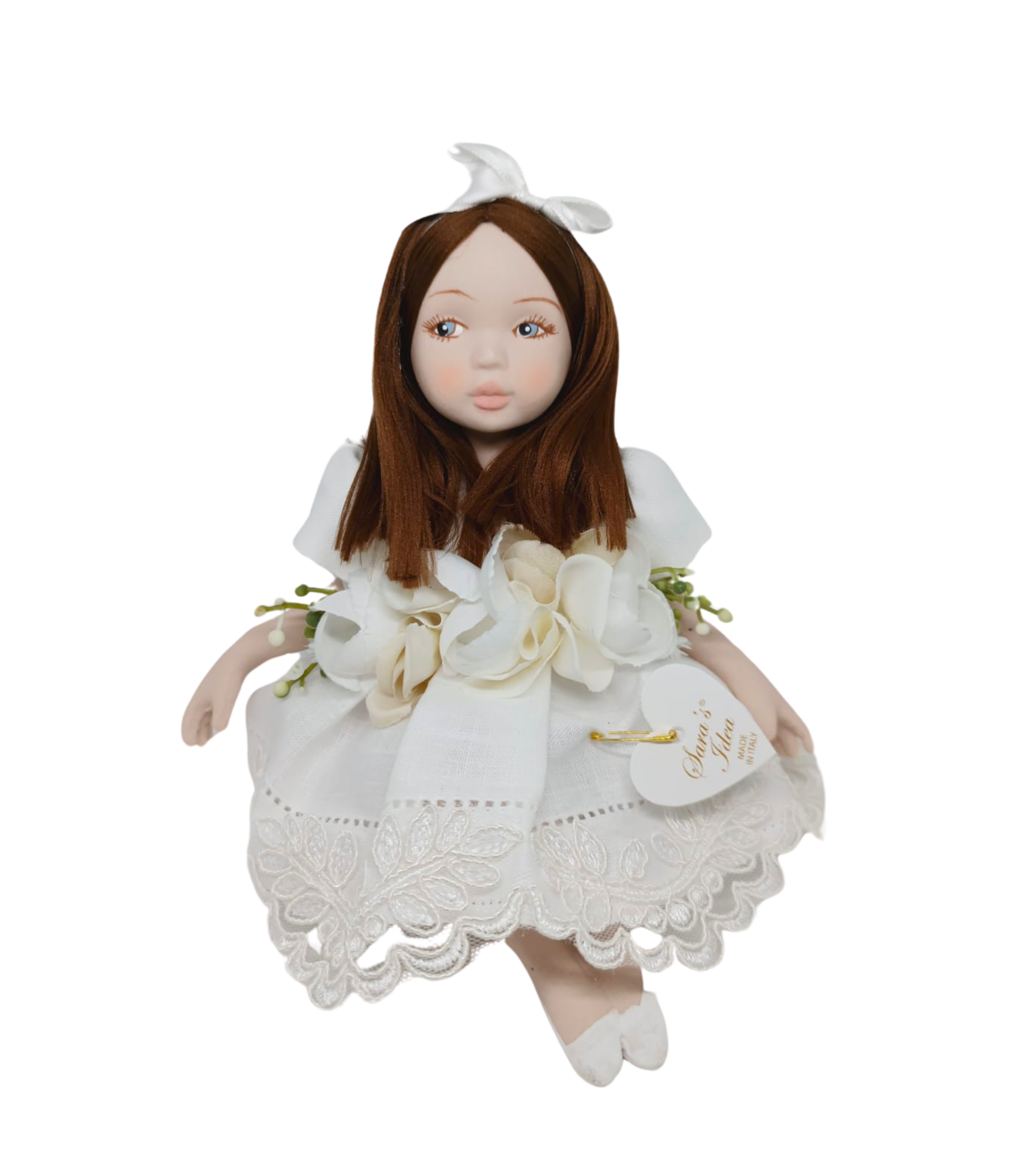 Bambole in ceramica Sara's Idea, disponibili nella loro scatola originale, comprese di confetti, tag-bigliettino e nastri per il confezionamento.