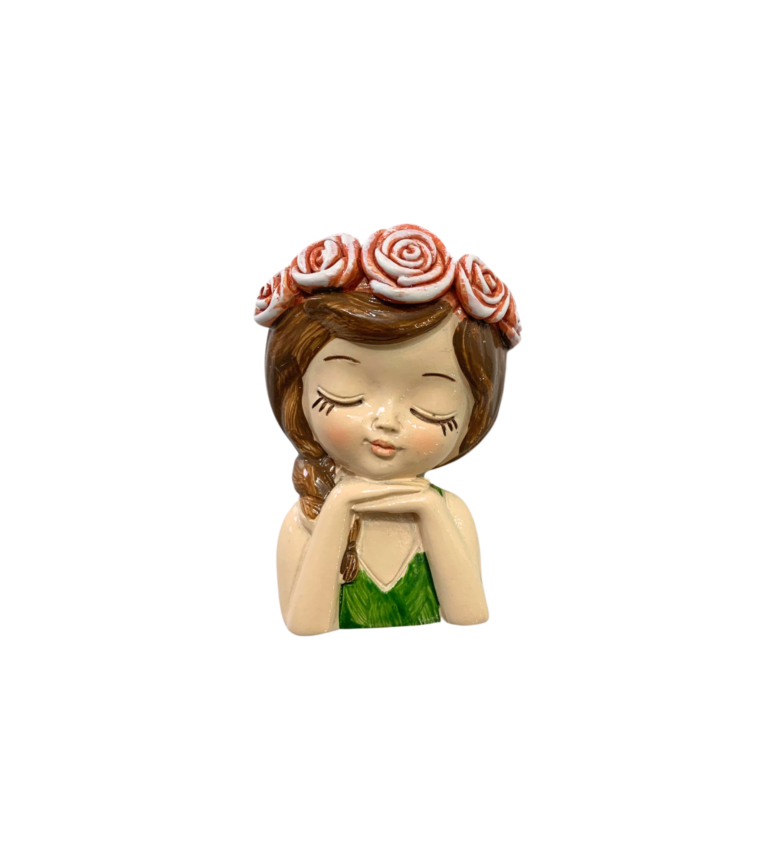 Bimba in resina con magnete della nuova collezione Harmony, confezionata su sacchetto originale, completa di confetti, tag-bigliettino e nastri per il confezionamento.