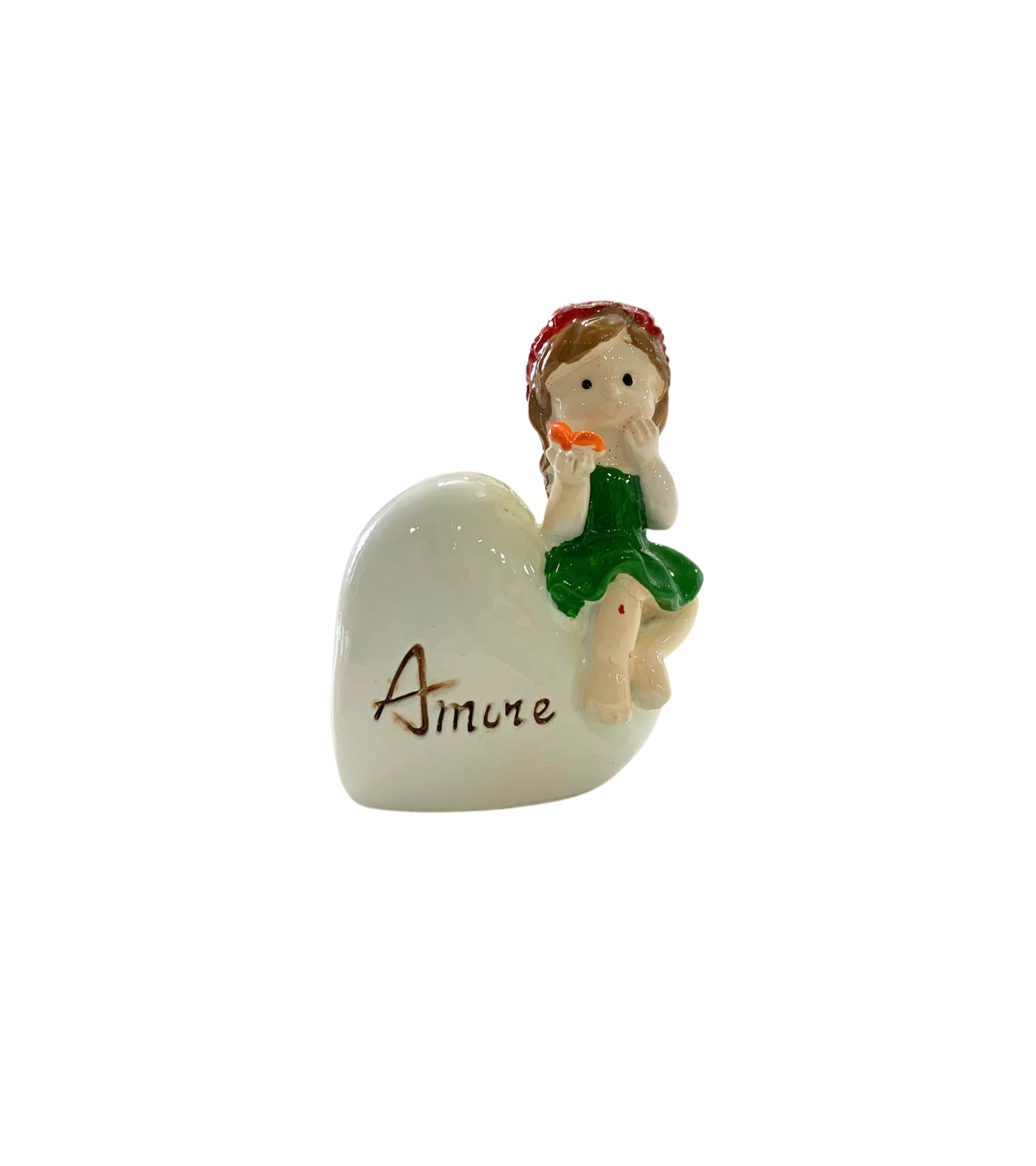 Bimba in resina su cuore con magnete della nuova collezione Harmony, confezionata su sacchetto originale, completa di confetti, tag-bigliettino e nastri per il confezionamento.