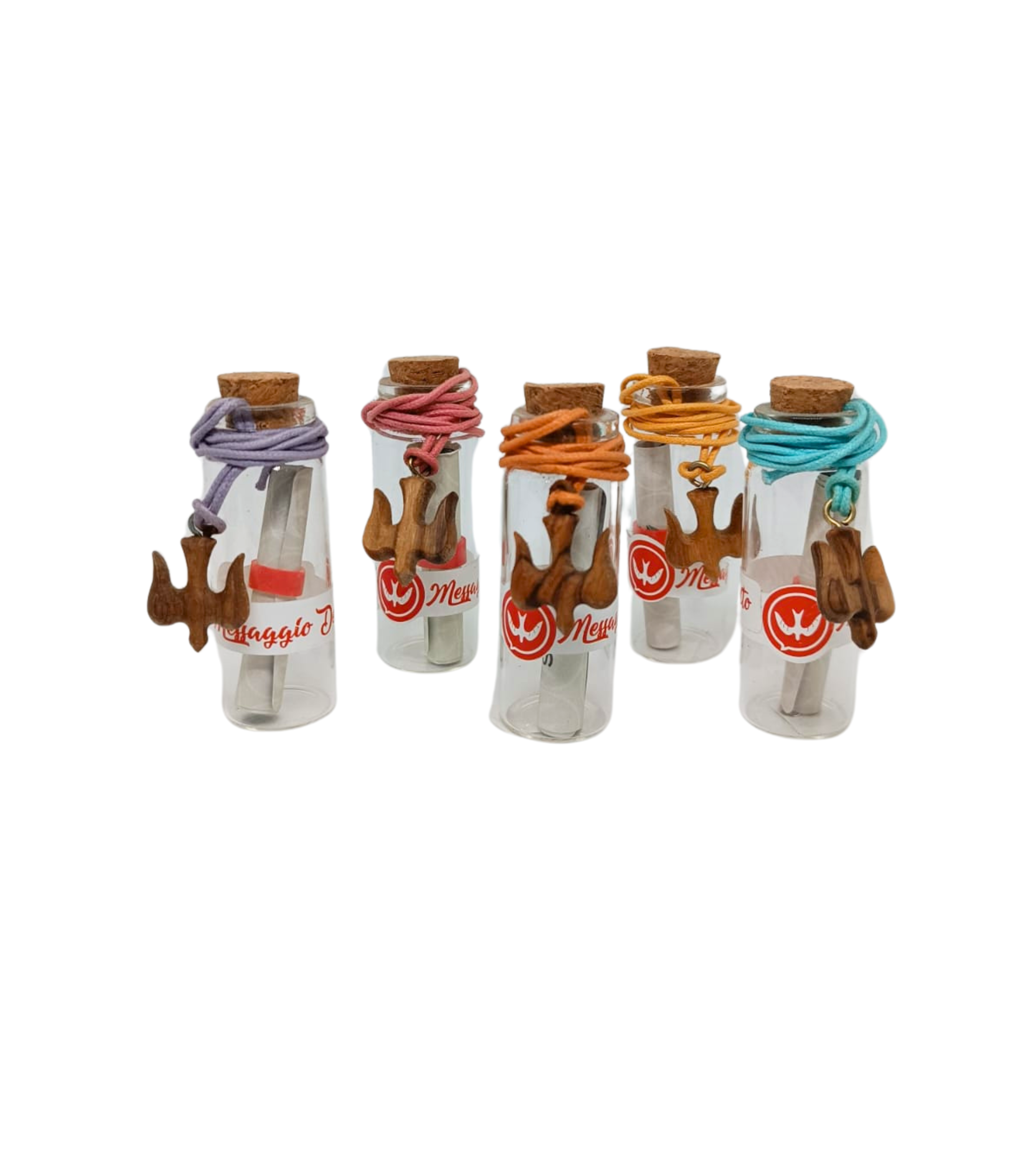 Bottigline in vetro con all'interno un messaggio dello Spirito Santo, confezionato con confetti, nastri e tag-bigliettino.