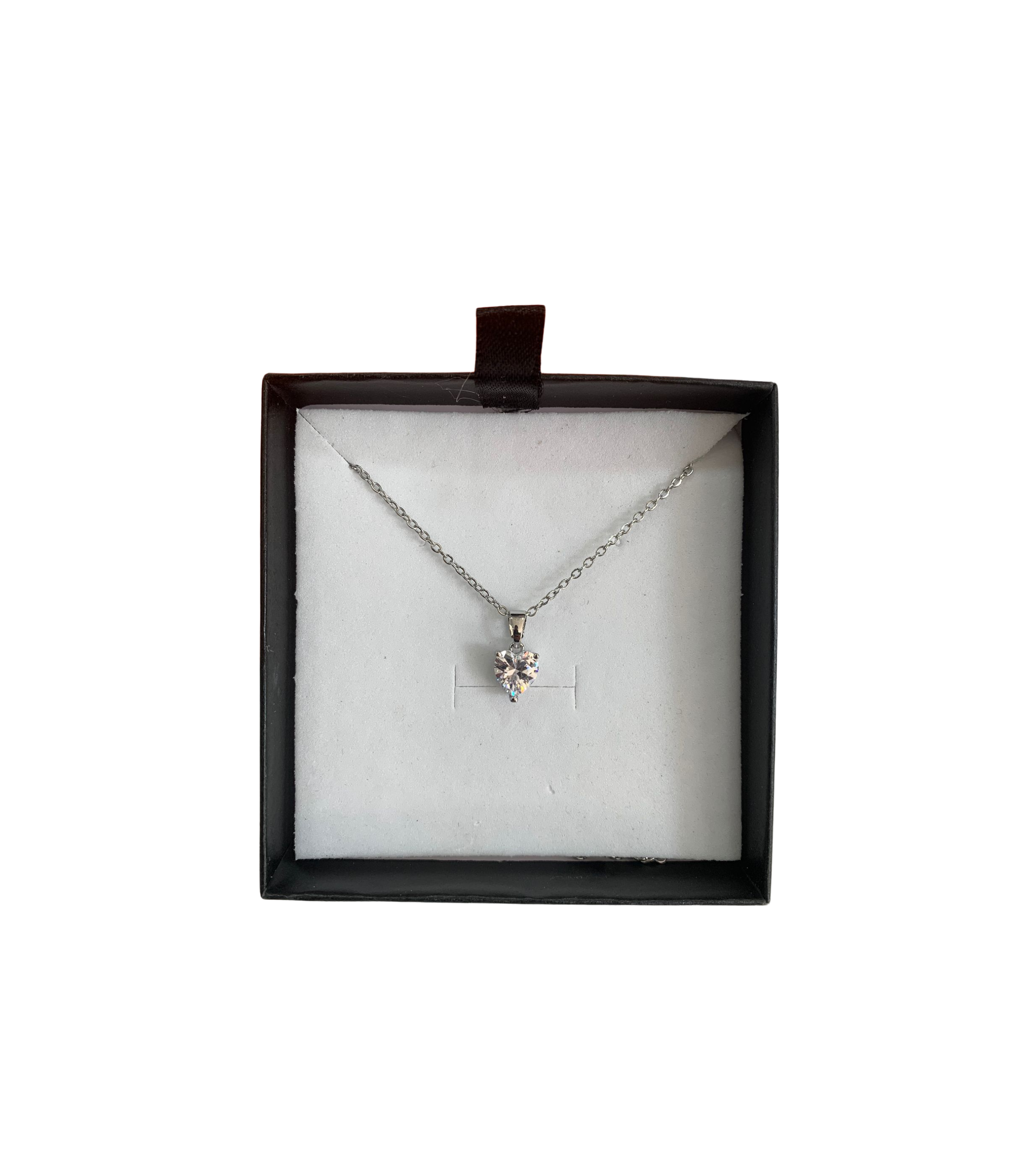 Collana con diamante a cuore confezionata nella sua scatola originale, completa di confetti, tag-bigliettino e nastri per il confezionamento.