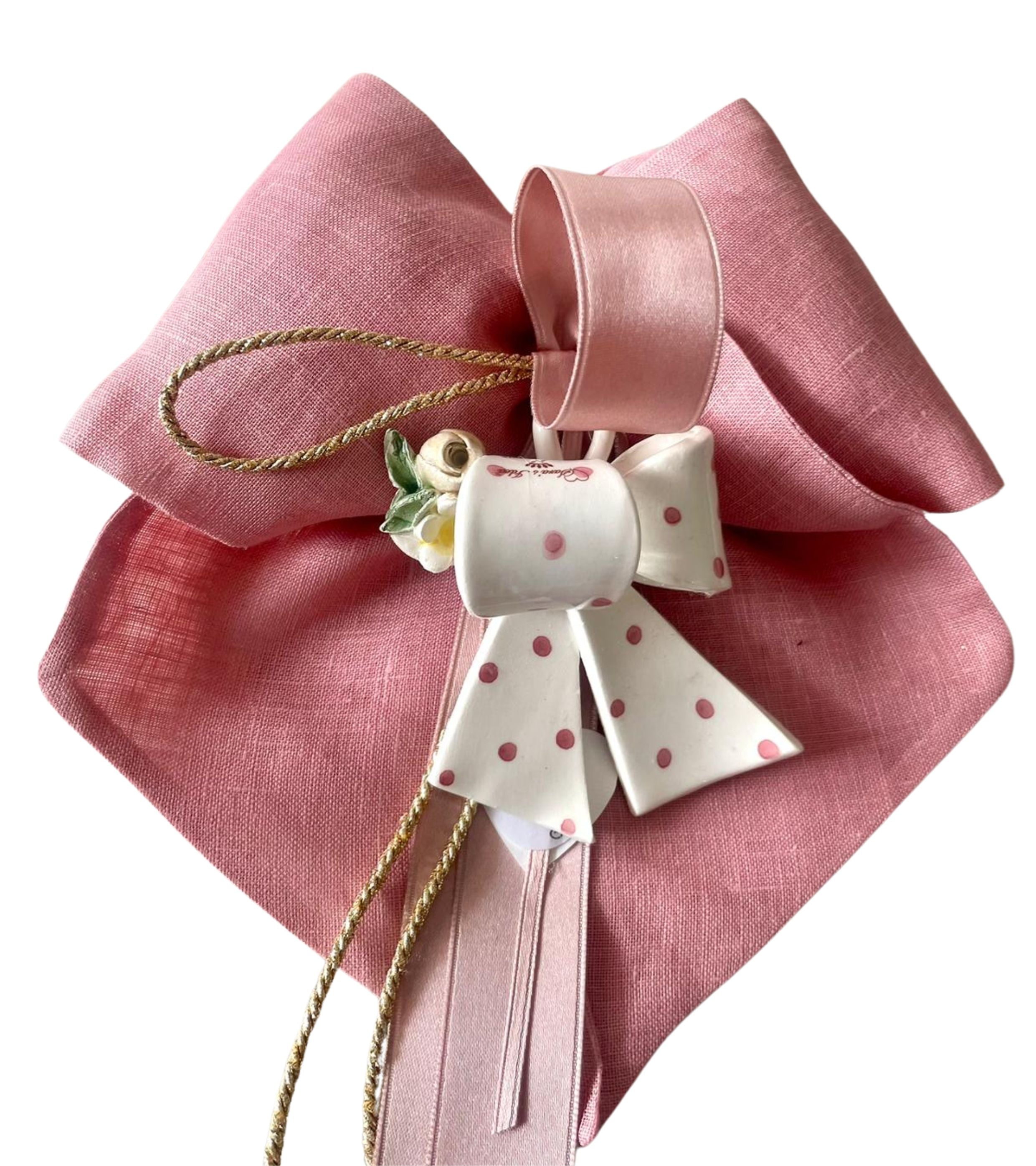 Fiocco in lino Sara's Idea con ceramiche di Capodimonte.