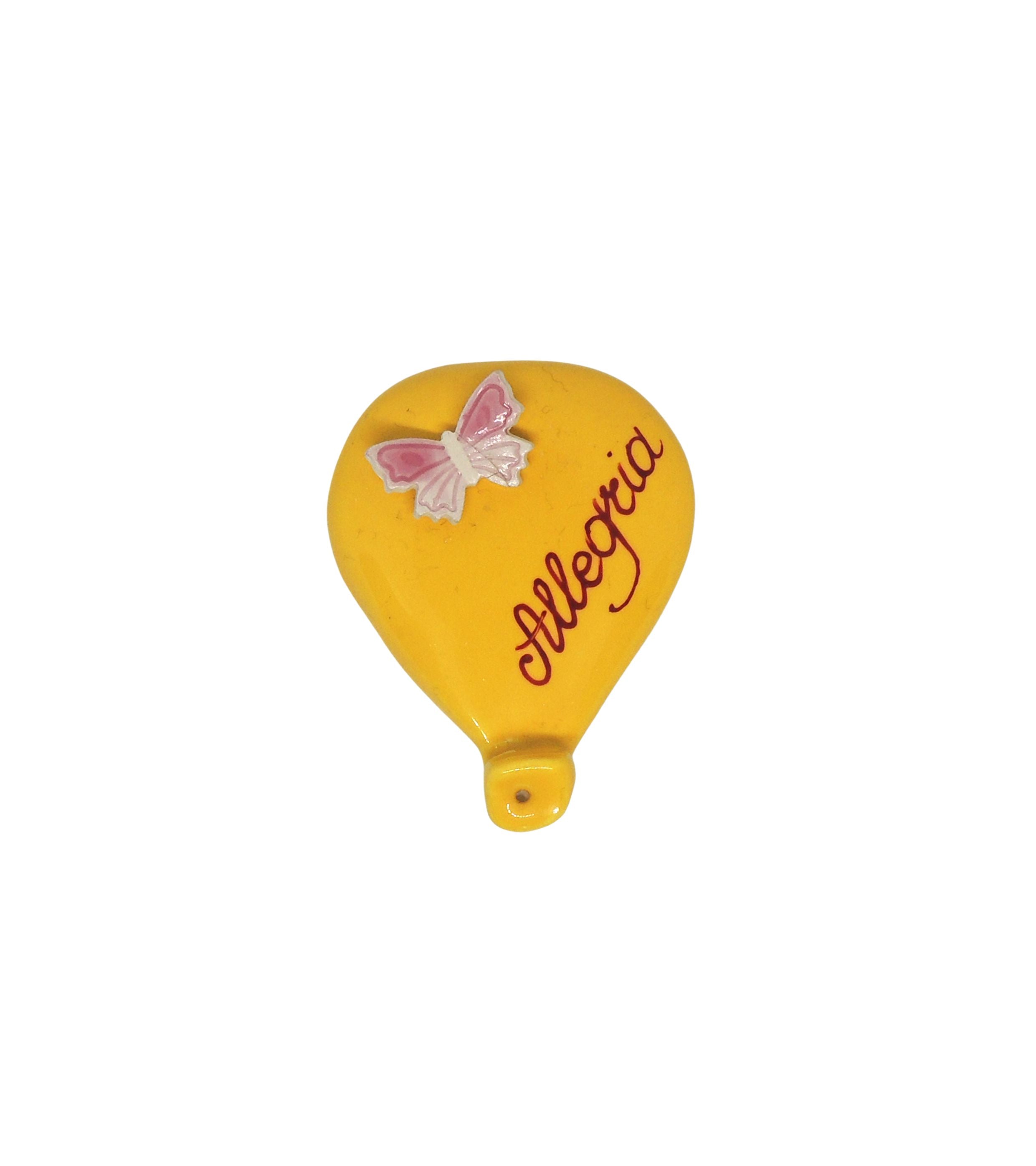 Palloncino con calamita e applicazioni di farfalle, cuori e fiori, realizzato a mano in ceramica Mak, personalizzabile sia nei colori che con nomi o iniziali. La personalizzazione è fatta sul prodotto finito con colori a freddo resistenti, pertanto non lavabile in lavastoviglie.