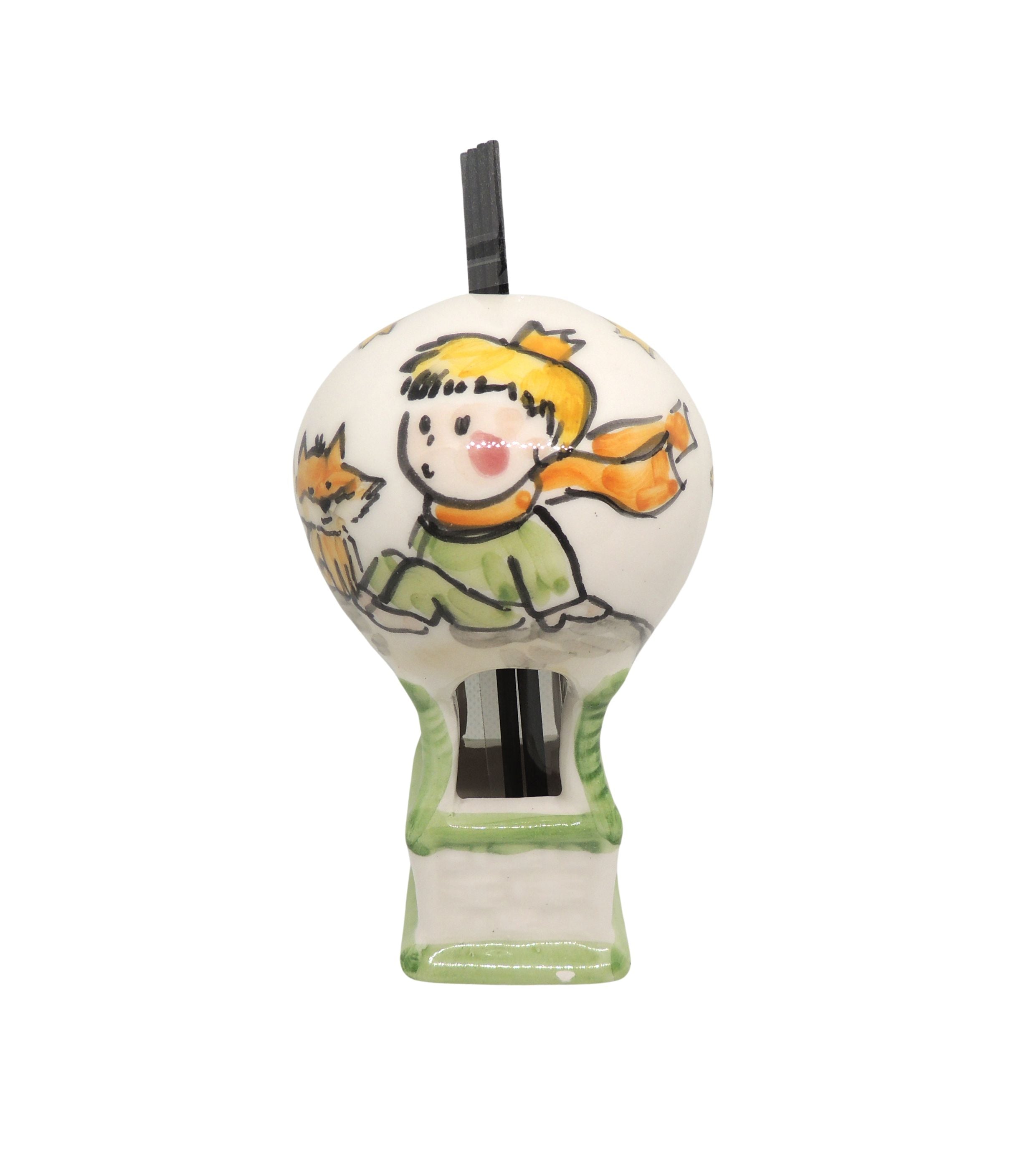 Profumatore a mongolfiera tema Piccolo Principe in ceramica vietrese, personalizzabile, realizzato e dipinto a mano dai Maestri Ceramisti con materiali e colori atossici.