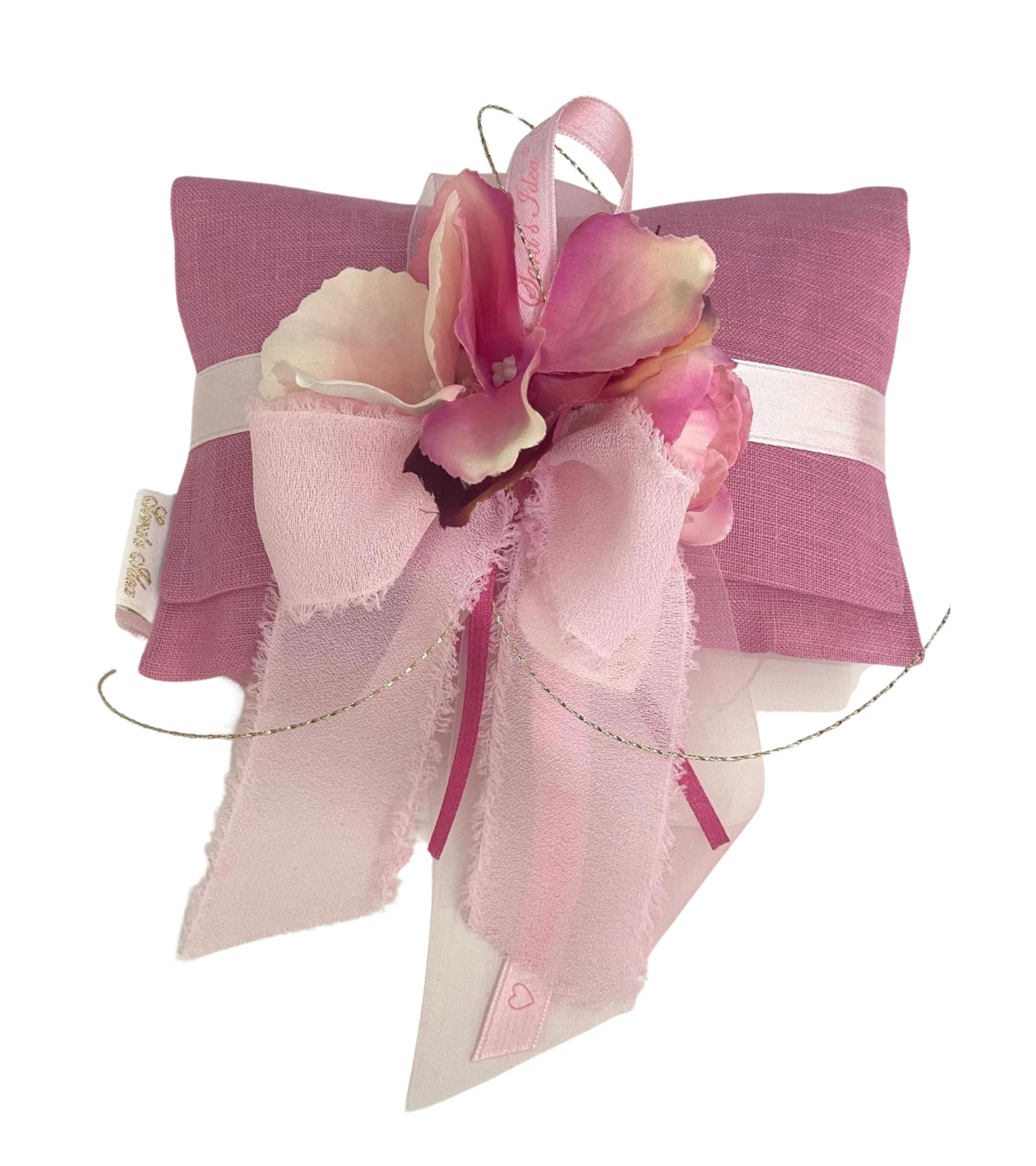 Elegante bustina in lino Sara's Idea con applicazioni di fiori profumati e nastri in chiffon, disponibile in vari colori.