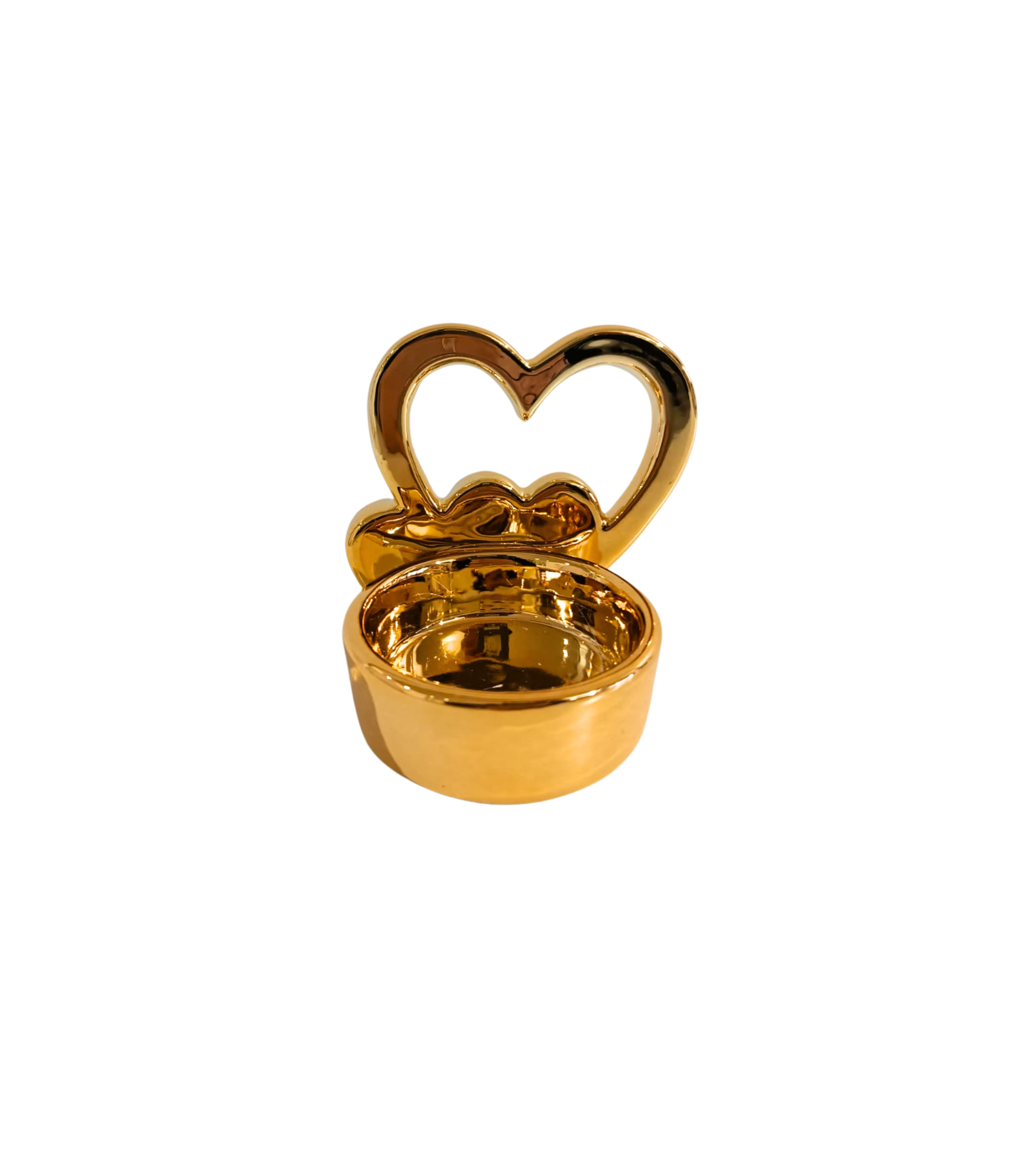Portacandela porcellana cuori oro, completo di confetti, tag-bigliettino e confezionamento.