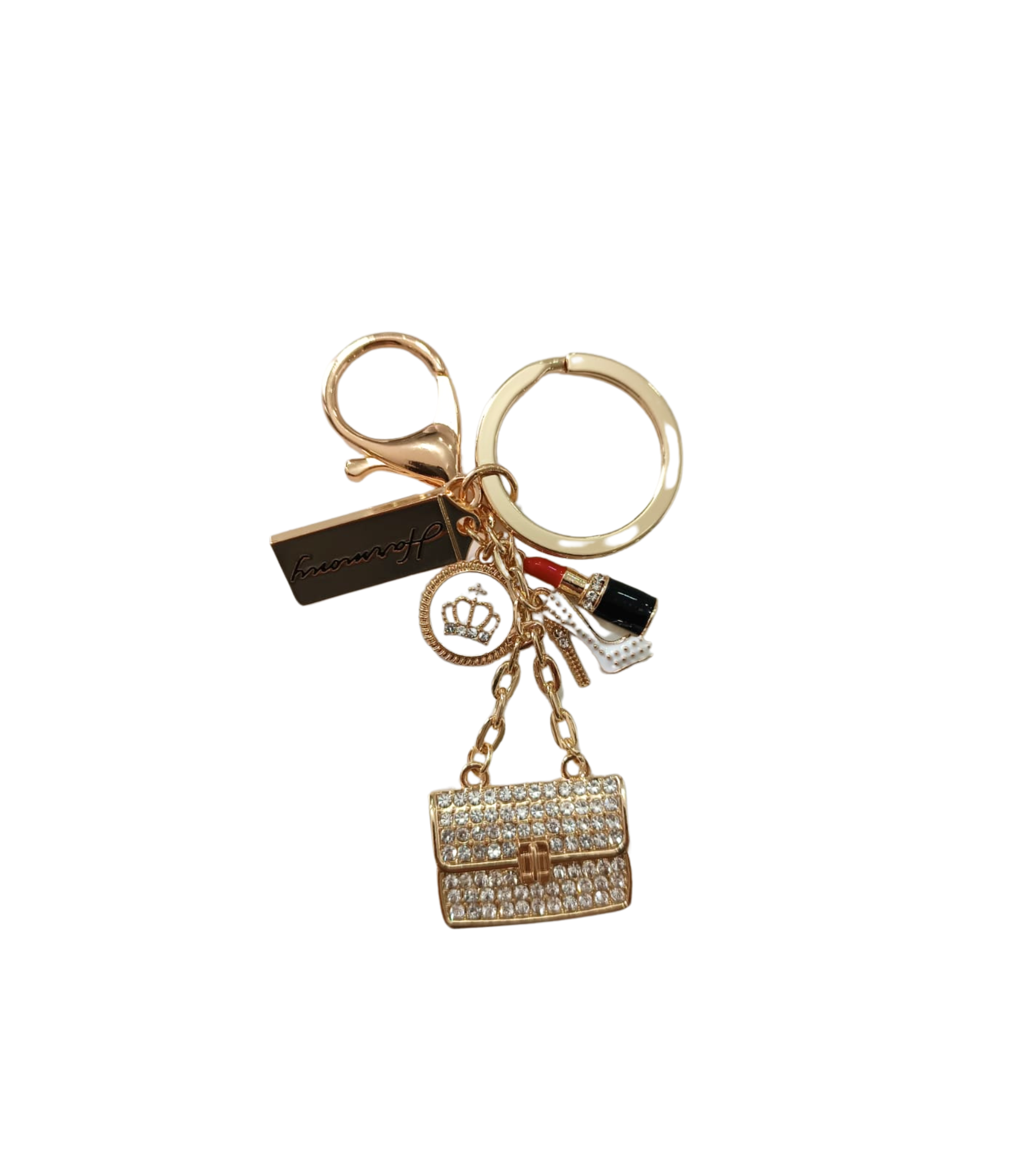 Portachiavi con borsetta oro e strass della nuova collezione Harmony , confezionato su sacchetto originale, completo di confetti, tag-bigliettino e nastri per il confezionamento.