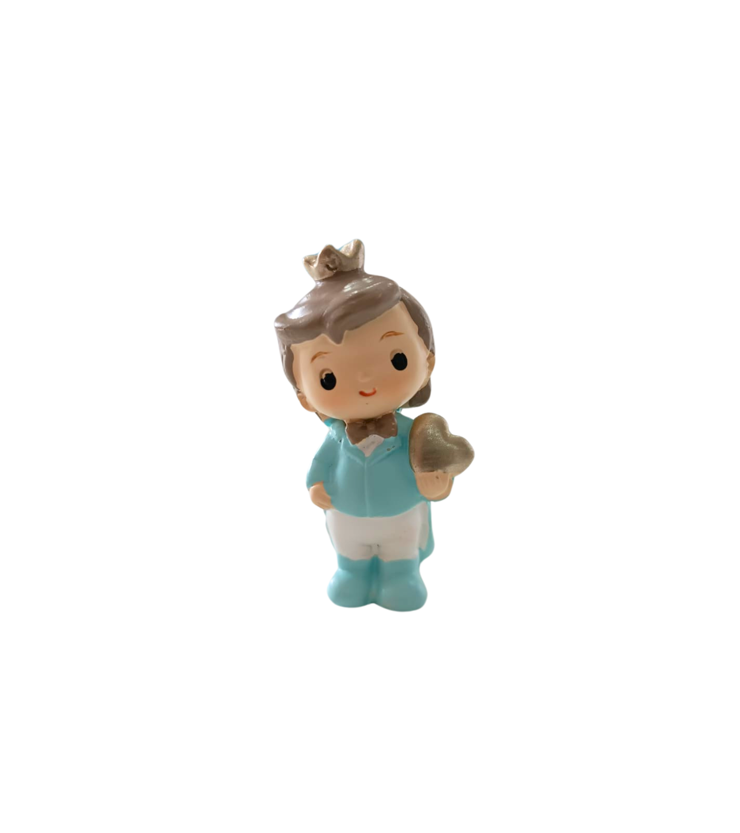 Principe in resina con cuore oro della nuova collezione Harmony, confezionato su veletto, completo di confetti, tag-bigliettino e nastri per il confezionamento.