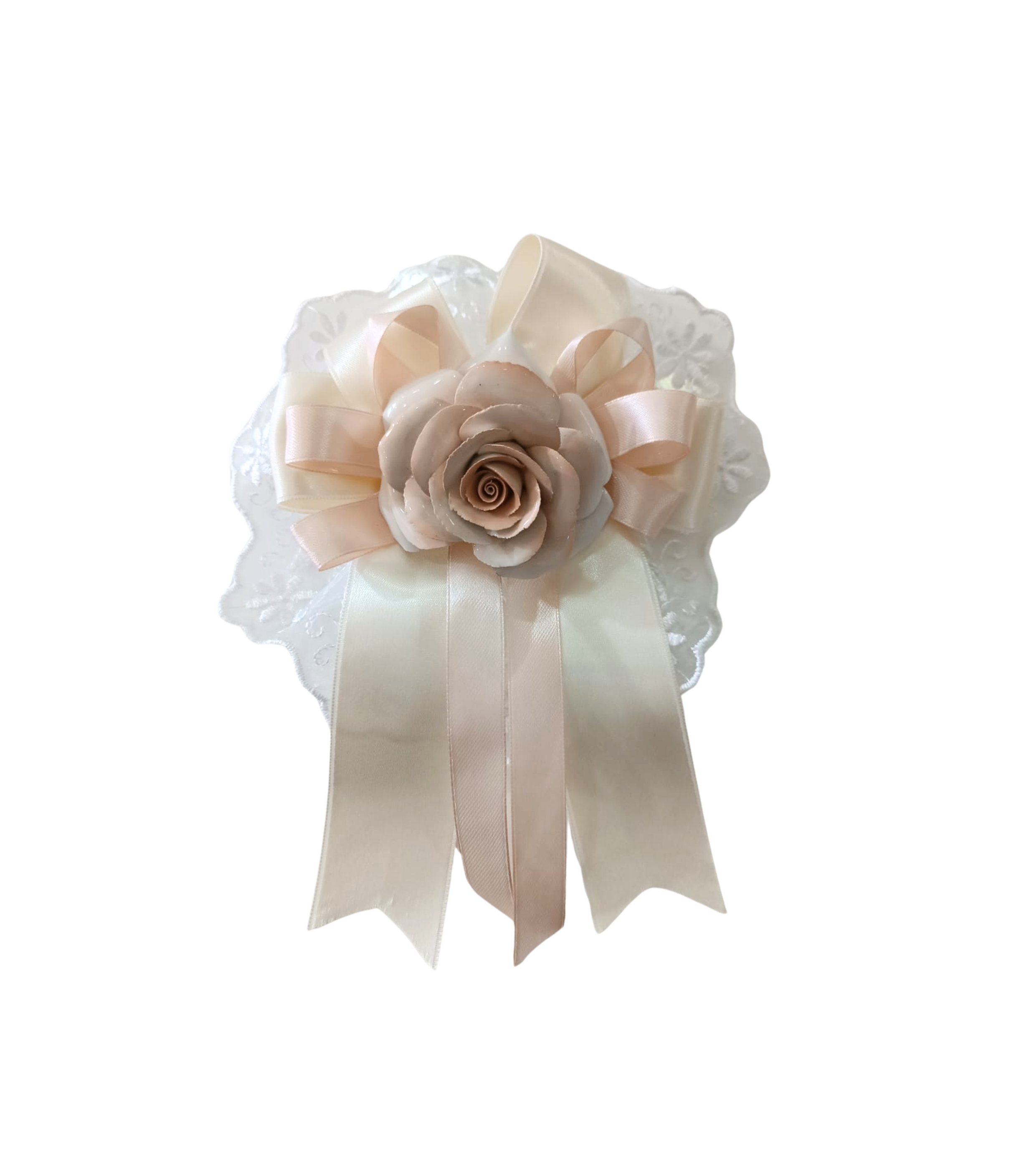 Rosa in ceramica di Capodimonte confezionata con pizzo e completa di confetti, nastri e tag-bigliettino.