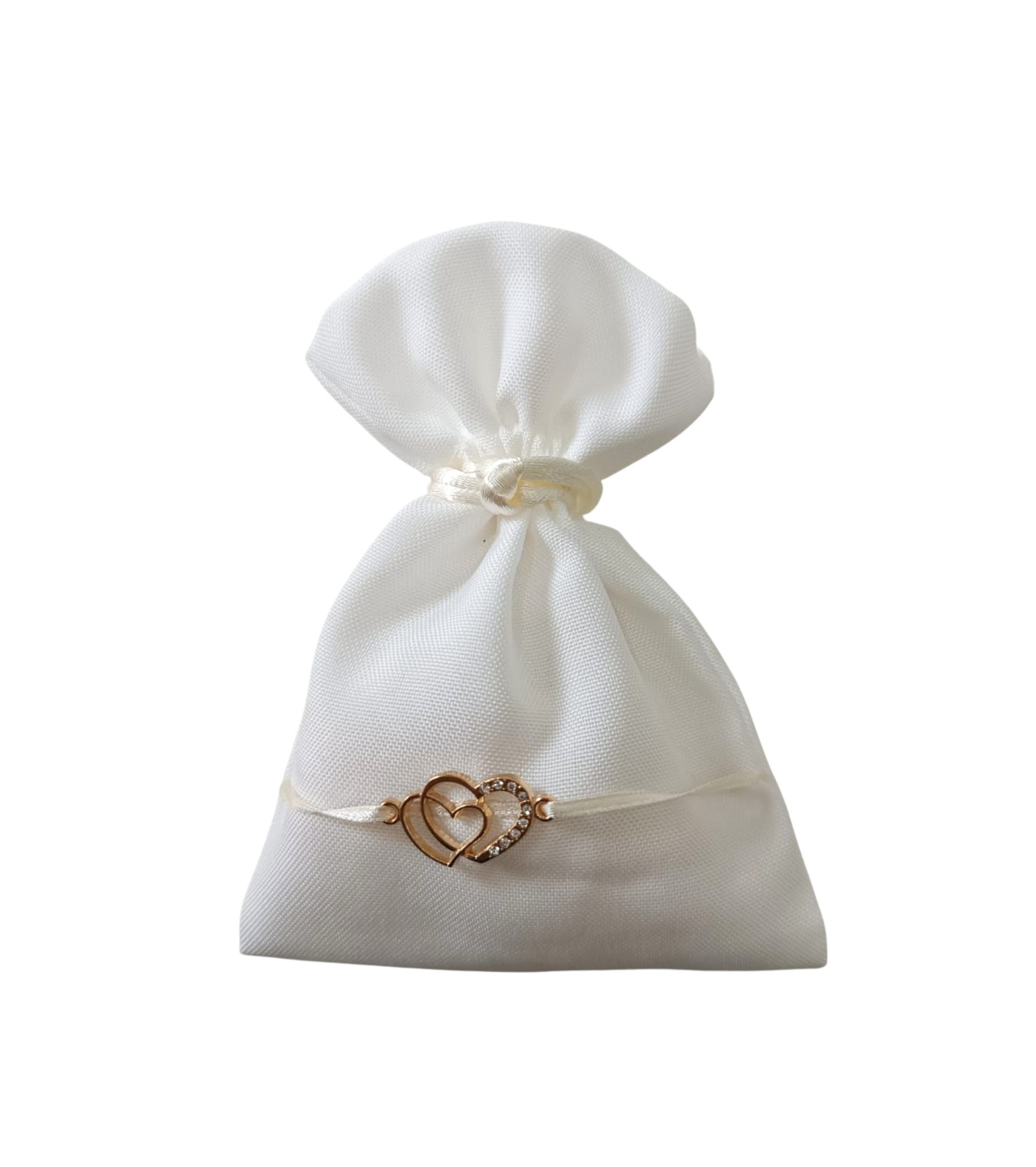 Sacchetto con applicazione della nuova collezione Harmony, completo di confetti, tag-bigliettino e nastri per il confezionamento.