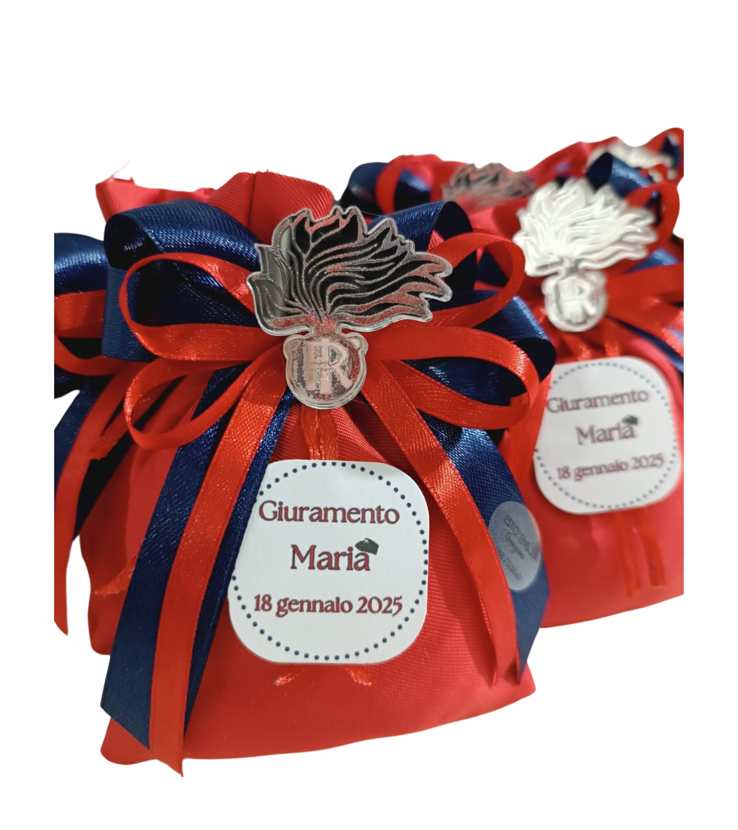 Sacchetto giuramento in cotone rosso con doppio fiocco e stemma in plexi, completo di confetti, nastri per il confezionamento e tag-bigliettino.