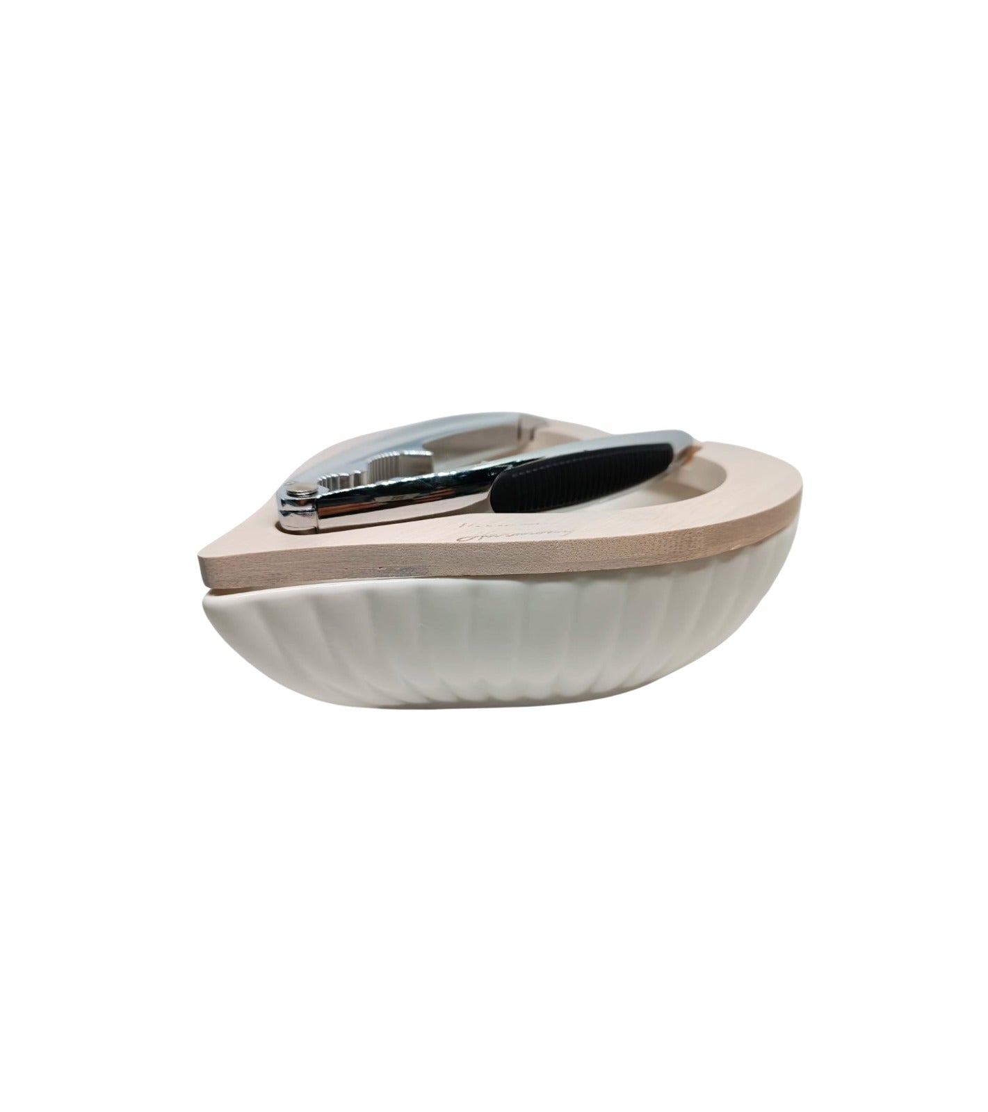 Set schiaccianoci in porcellana Harmony confezionato nella sua scatola originale, completo di confetti, tag-bigliettino e nastri per il confezionamento.