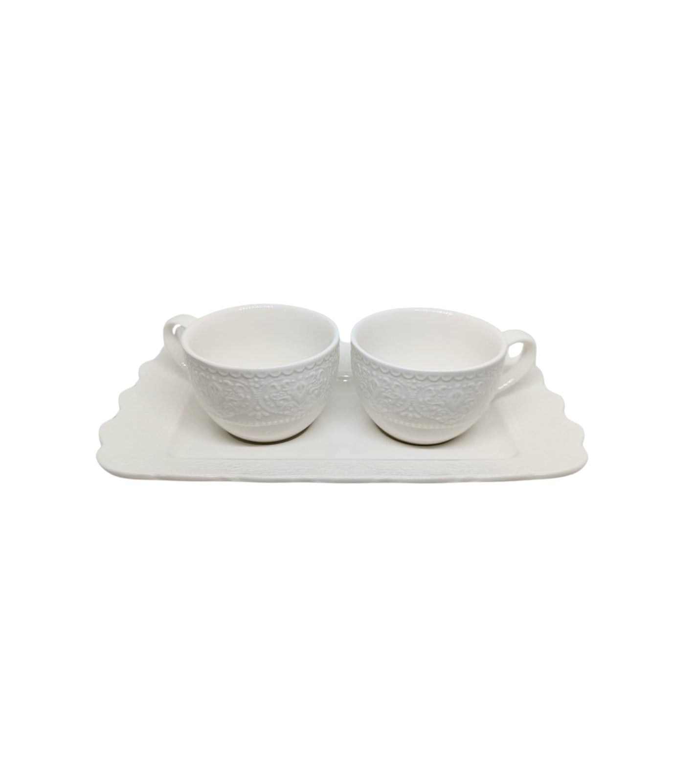 Set tazzine con vassoio in porcellana Harmony, decoro alice, confezionato nella sua scatola originale, completo di confetti, tag-bigliettino e nastri per il confezionamento.