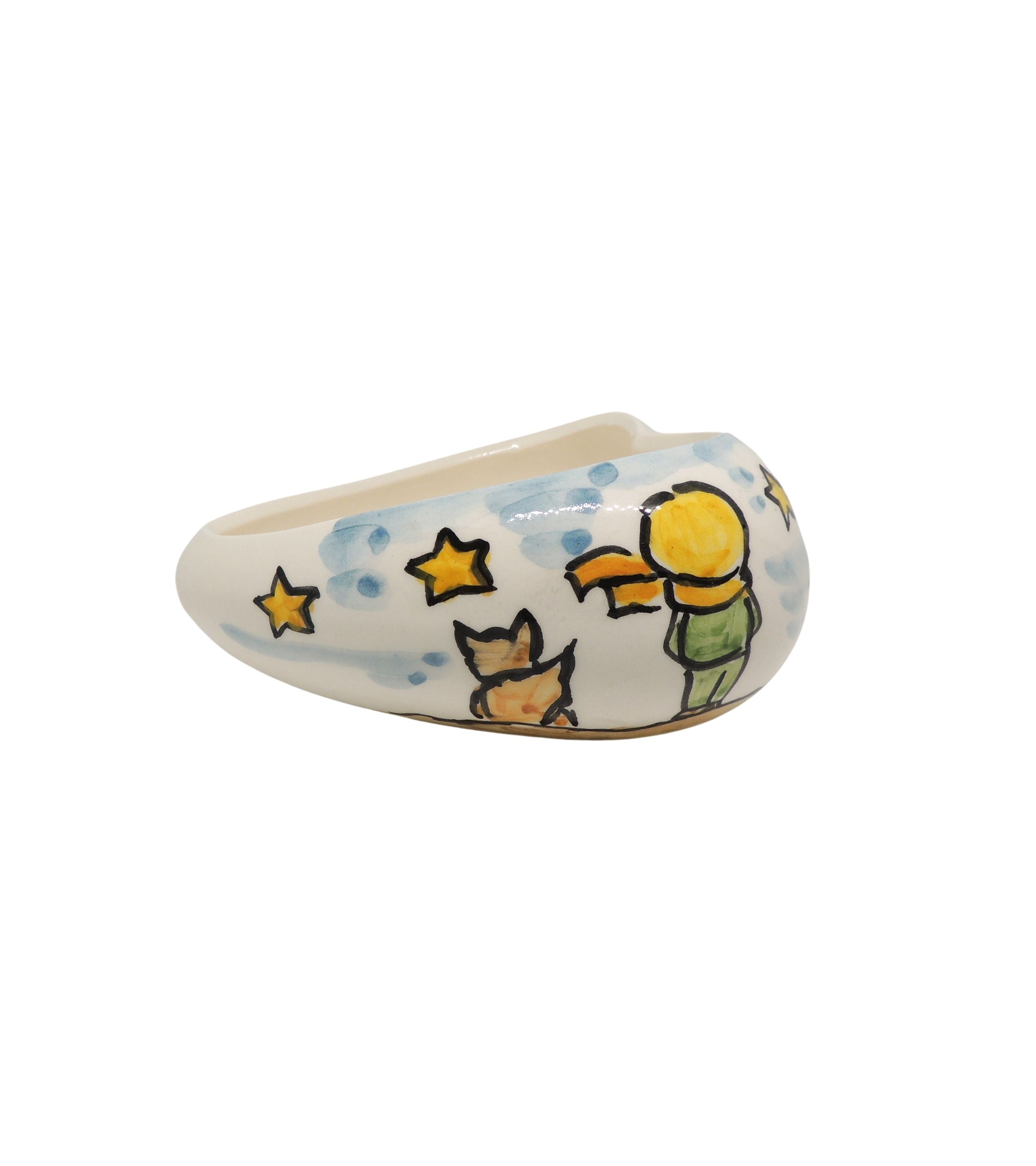 Svuotatasche e portapiantine a forma di cuore tema Piccolo Principe in ceramica vietrese, personalizzabile, realizzato e dipinto a mano dai Maestri Ceramisti con materiali e colori atossici.